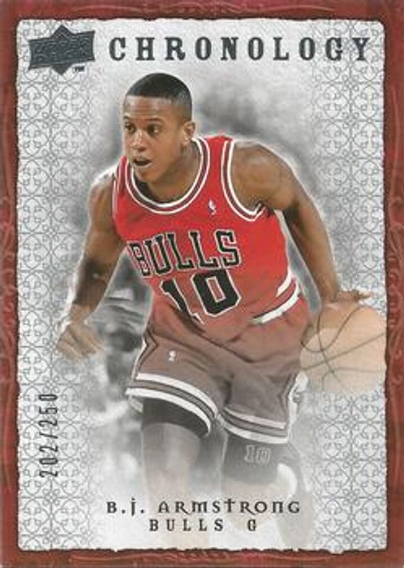 The BJ Armstrong 2007 Upper Deck Chronology #3 Base /250 card is 1 of 5 BJ Armstrong's card variations in the 2007 Upper Deck Chronology set being tracked by Sports Card Investor, including Autographs, Historically Accurate /50, Autographs Gold /10, and Historically Accurate Gold /10.