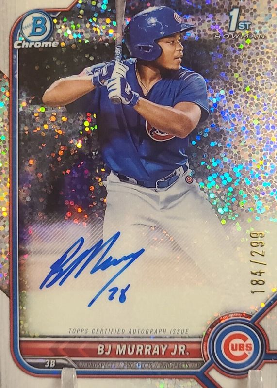 The BJ Murray Jr. 2022 Bowman Chrome #CPA-BM Prospect Auto - Speckle Refractor /299 (1st) card in Raw condition has moved up $5.40 (+340%) in the last 30 days and was last sold for $6.99 .