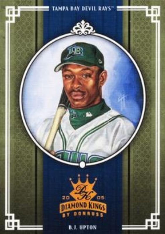The BJ Upton 2005 Diamond Kings #225 Bronze /50 card is 1 of 41 BJ Upton's card variations in the 2005 Diamond Kings set being tracked by Sports Card Investor, including Base, Framed Red, Non Canvas, Framed Blue /100, and Framed Green /50.