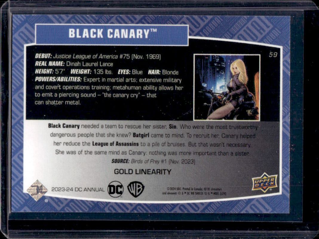 The Black Canary 2023 Upper Deck DC Annual #59 Gold Linearity /88 card is 1 of 21 Black Canary's card variations in the 2023 Upper Deck DC Annual set being tracked by Sports Card Investor, including Base, Blue, Silver Sparkle, Variant Cover, and Green /499.