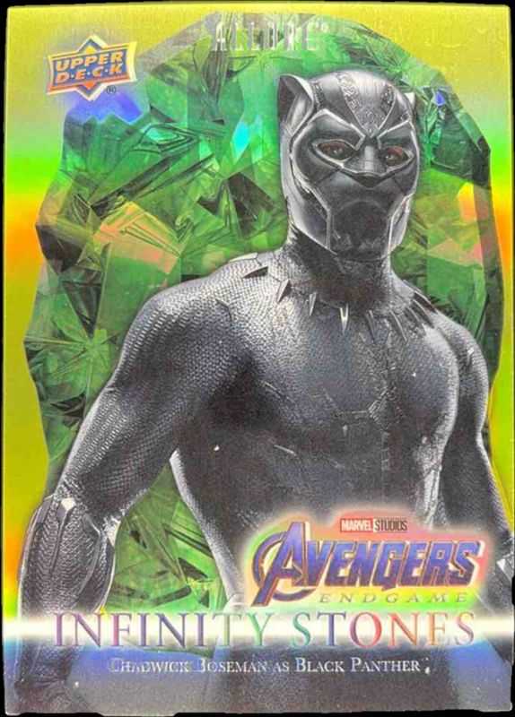 The Black Panther 2022 Upper Deck Marvel Allure #IS-11 Infinity Stones Time Stone Gold /99 card is 1 of 83 Black Panther's card variations in the 2022 Upper Deck Marvel Allure set being tracked by Sports Card Investor, including #67 Base, #53 Base, #103 Base, #78 Base, and #53 Black Rainbow.