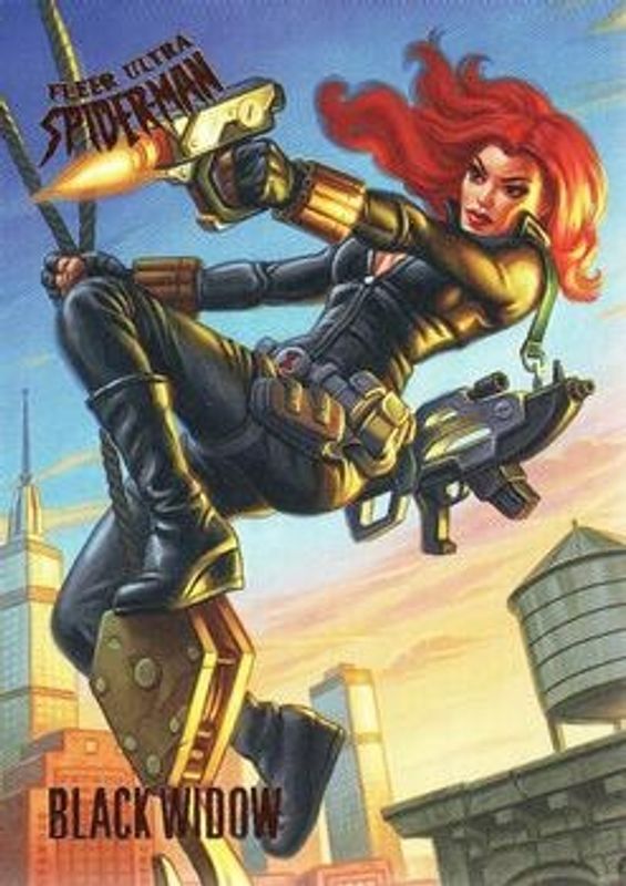 The Black Widow 2017 Fleer Ultra Spider-Man #54 Base card is 1 of 35 Black Widow's card variations in the 2017 Fleer Ultra Spider-Man set being tracked by Sports Card Investor, including Silver Web Foil, Gold Web Foil Autographs /49, Printing Plate Black /1, Printing Plate Cyan /1, and Printing Plate Magenta /1.