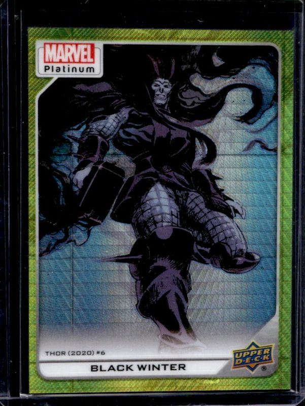 The Black Winter 2023 Upper Deck Marvel Platinum #127 Yellow Spotlight /399 card is 1 of 30 Black Winter's card variations in the 2023 Upper Deck Marvel Platinum set being tracked by Sports Card Investor, including Base, Black Rainbow, Blue Rainbow, Blue Surge, and Purple Rainbow.