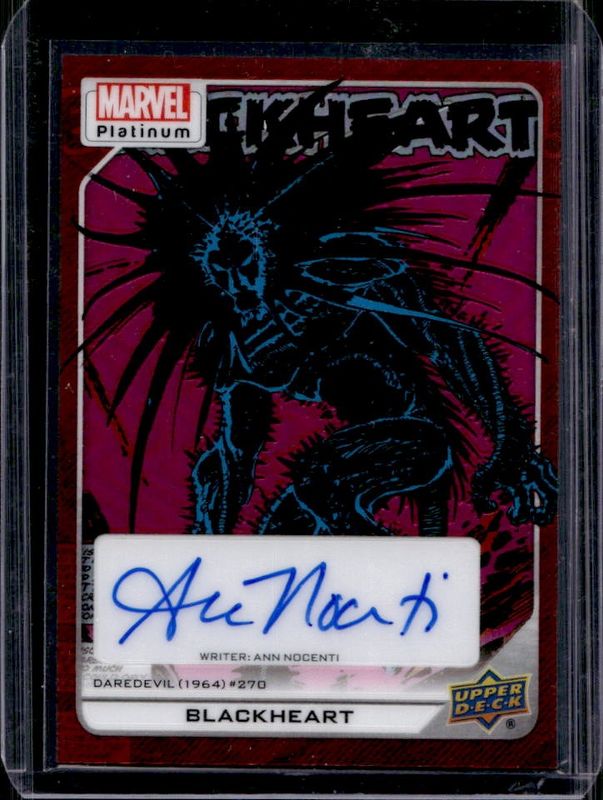 The Blackheart 2023 Upper Deck Marvel Platinum #144 Red Rainbow Autographs card is 1 of 30 Blackheart's card variations in the 2023 Upper Deck Marvel Platinum set being tracked by Sports Card Investor, including Base, Black Rainbow, Blue Rainbow, Blue Surge, and Purple Rainbow.