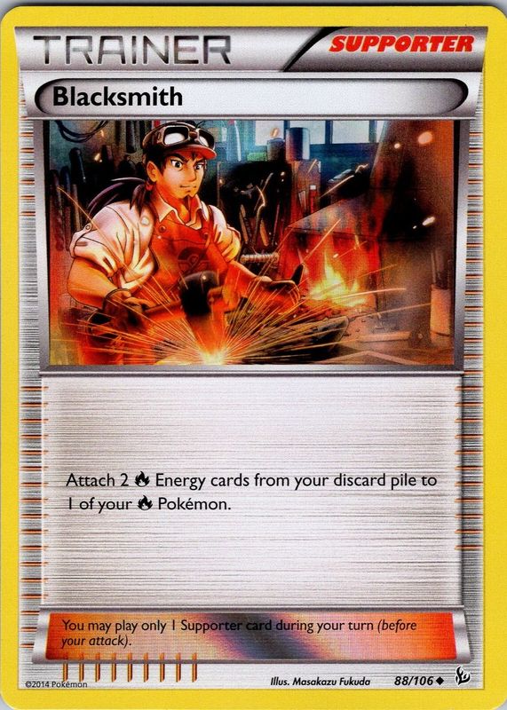 The Blacksmith 2014 XY: Flashfire #088/106 Promo (Sheen Holo) card in Raw TCG (Lightly Played) condition has not changed in price in the last 30 days and was last sold for $2.99 .