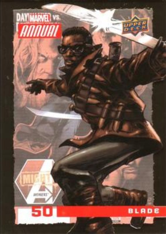 The Blade 2020 Upper Deck Marvel Annual #50 Gold card is 1 of 7 Blade's card variations in the 2020 Upper Deck Marvel Annual set being tracked by Sports Card Investor, including Base, Red, Printing Plate Black /1, Printing Plate Cyan /1, and Printing Plate Magenta /1.