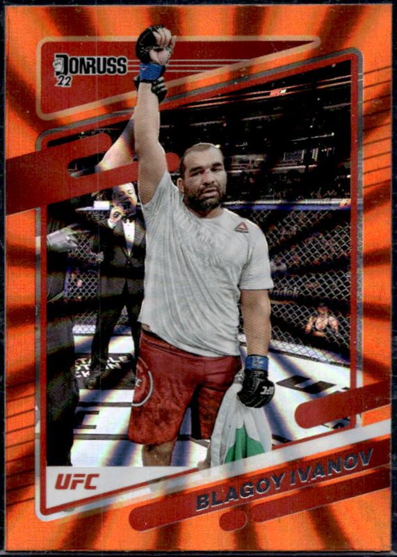 The Blagoy Ivanov 2022 Donruss UFC #196 Holo Orange Laser card is 1 of 14 Blagoy Ivanov's card variations in the 2022 Donruss UFC set being tracked by Sports Card Investor, including Base, Green Flood, Holo Pink Laser, Press Proof Purple, and Press Proof Silver.