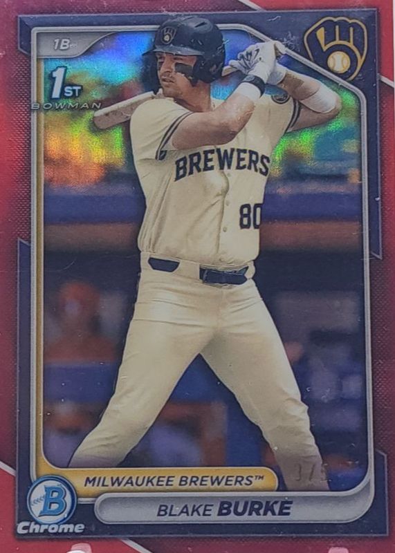 The Blake Burke 2024 Bowman Draft #BDC-95 Chrome - Red Refractor /5 (1st) card in Raw condition has not changed in price in the last 30 days and was last sold for $139.04 .