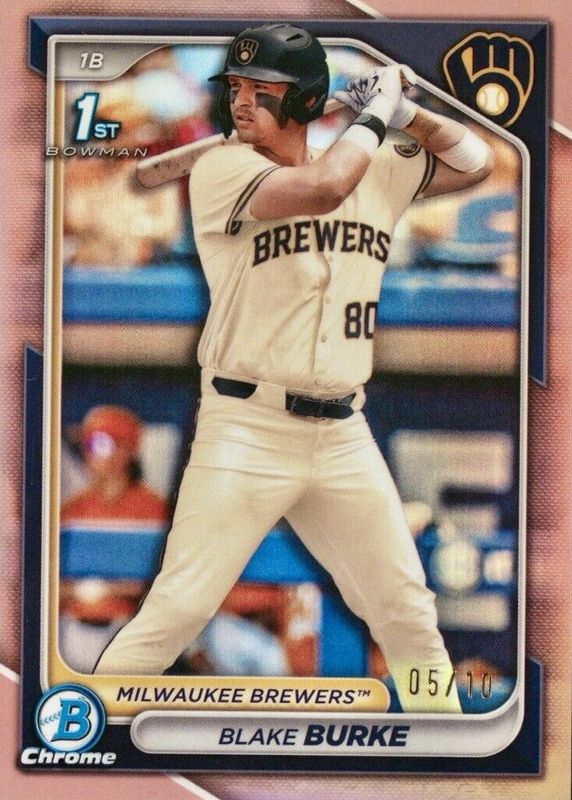 The Blake Burke 2024 Bowman Draft #BDC-95 Chrome - Rose Gold Refractor /10 (1st) card in Raw condition has not changed in price in the last 30 days and was last sold for $44.99 .