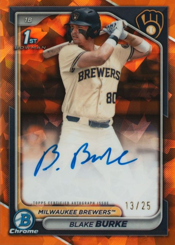 This card is 1 of 13 Blake Burke's card variations in the 2024 Bowman Draft Sapphire Edition set being tracked by Sports Card Investor, including Chrome (1st), Chrome - Yellow /75 (1st), Chrome - Gold /50 (1st), Chrome - Orange /25 (1st), and Chrome - Black /10 (1st).