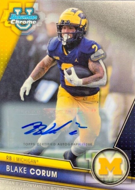 This card is 1 of 19 Blake Corum's card variations in the 2023 Bowman Chrome University set being tracked by Sports Card Investor, including Prospect Auto - Refractor /499, Prospect Auto - Fuchsia Mini-Diamond Refractor /150, Prospect Auto - Green Refractor /99, Ramblin' Man Autographs /99, and Prospect Auto - Yellow Refractor /75.
