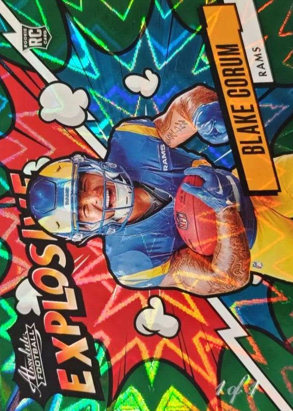 The Blake Corum 2024 Absolute #EX-BCM Explosive - Green /1 Rookie card in Raw condition has not changed in price in the last 30 days and was last sold for $641.00 .