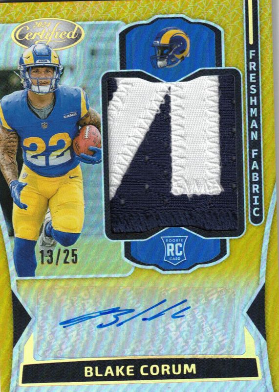 The Blake Corum 2024 Certified #FMS-BCM Freshman Fabric Signatures - Mirror Gold /25 Rookie card in Raw condition has not changed in price in the last 30 days and was last sold for $55.00 .