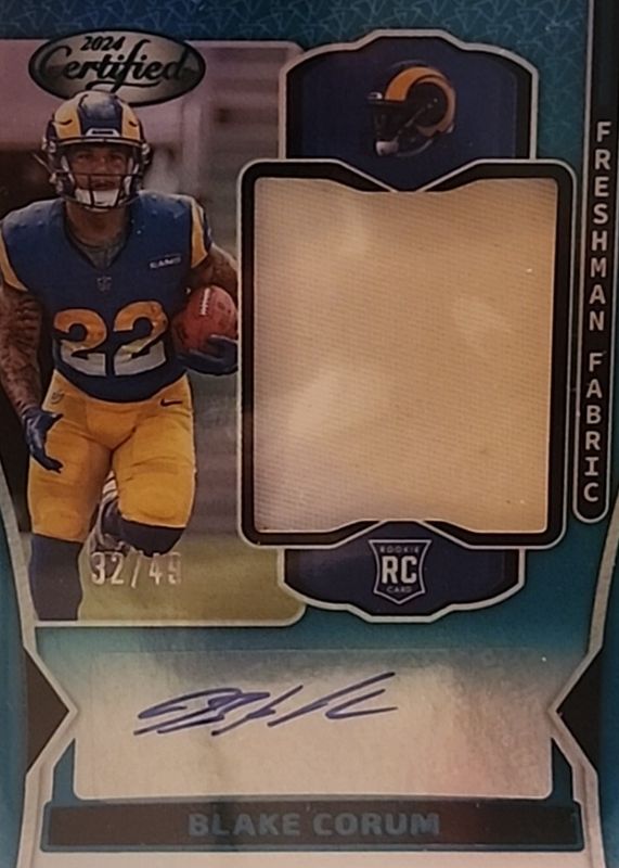 Blake Corum 2024 Certified #FMS-BCM Freshman Fabric Signatures - Mirror Teal /49 Rookie RAW Price Guide