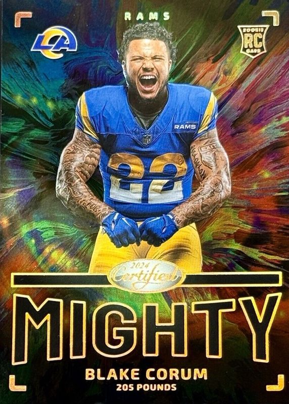 The Blake Corum 2024 Certified #TM-BC The Mighty /(SSP) Rookie card in Raw condition has not changed in price in the last 30 days and was last sold for $16.42 .