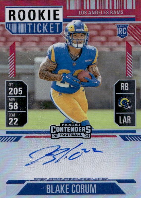 This card is 1 of 28 Blake Corum's card variations in the 2024 Contenders set being tracked by Sports Card Investor, including Rookie Ticket Auto, Rookie Ticket Auto - Opening Kickoff Ticket, Rookie Ticket Auto - Red Zone Ticket, Rookie Ticket Auto - Ticket Stub (/22), and Rookie Ticket Auto Variation.