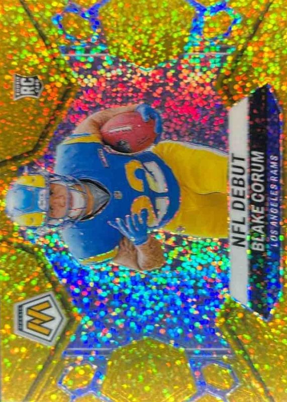 The Blake Corum 2024 Mosaic #278 NFL Debut - Gold Sparkle /24 Rookie card in Raw condition has not changed in price in the last 30 days and was last sold for $52.00 .
