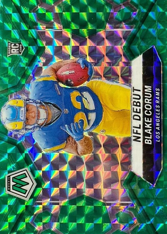 The Blake Corum 2024 Mosaic #278 NFL Debut - Green Rookie card in Raw condition has moved down -$1.26 (-56.0%) in the last 30 days and was last sold for $0.99 .