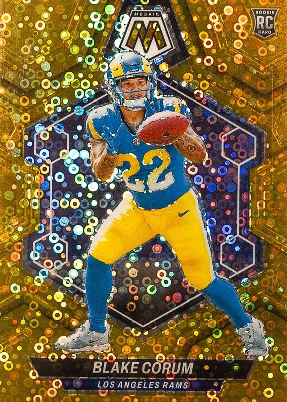 The Blake Corum 2024 Mosaic #368 No Huddle Gold /10 Rookie card in Raw condition has not changed in price in the last 30 days and was last sold for $24.50 .