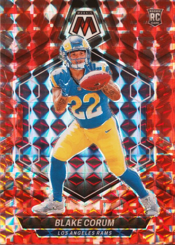 The Blake Corum 2024 Mosaic #368 Red Camo Rookie card in Raw condition has not changed in price in the last 30 days and was last sold for $1.00 .