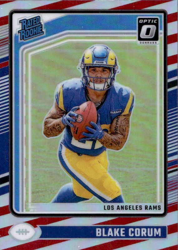 The Blake Corum 2024 Optic #208 Freedom /(SSP) Rookie card in Raw condition has not changed in price in the last 30 days and was last sold for $15.00 .