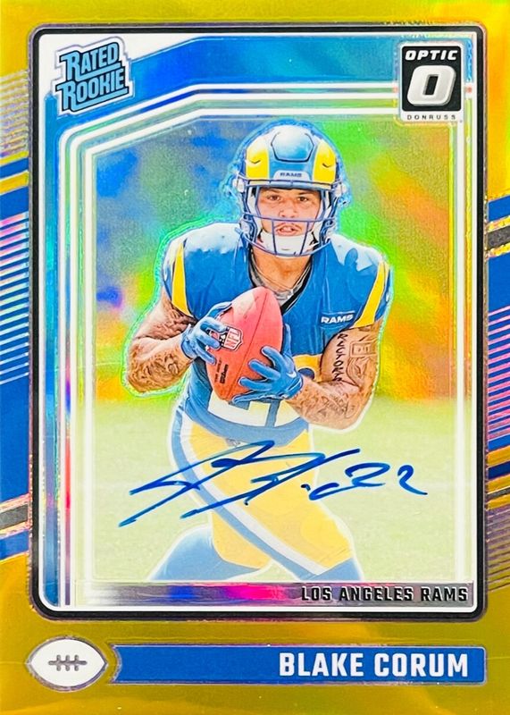The Blake Corum 2024 Optic #208 Rated Rookie Autographs - Gold /10 card in Raw condition has not changed in price in the last 30 days and was last sold for $113.50 .