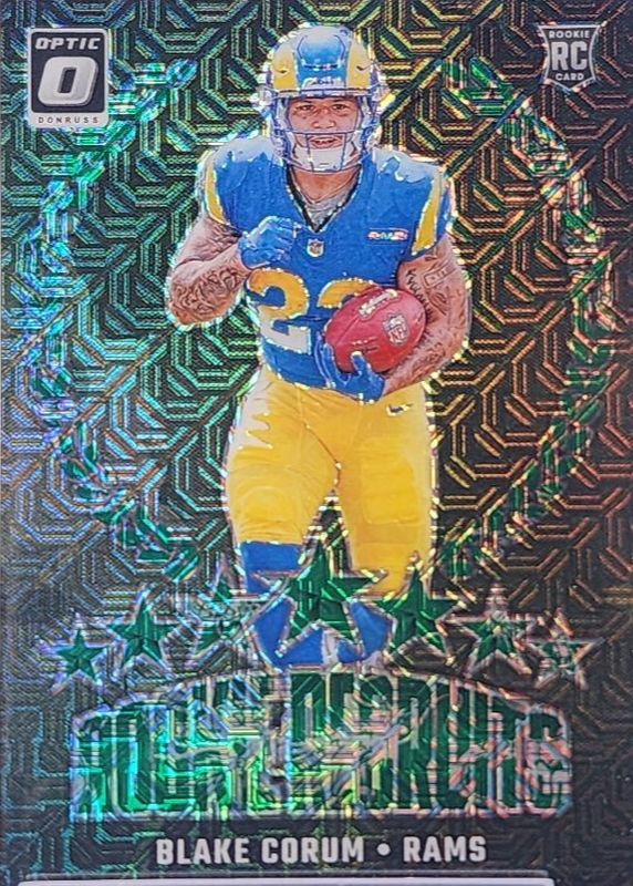 This card is 1 of 75 Blake Corum's card variations in the 2024 Optic set being tracked by Sports Card Investor, including Base, Blue Hyper, Blue Scope, Green Hyper, and Green Velocity.