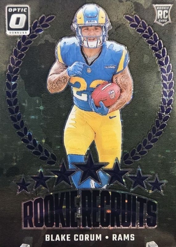 The Blake Corum 2024 Optic #16 Rookie Recruits - Purple Stars /25 card in Raw condition has not changed in price in the last 30 days and was last sold for $8.50 .