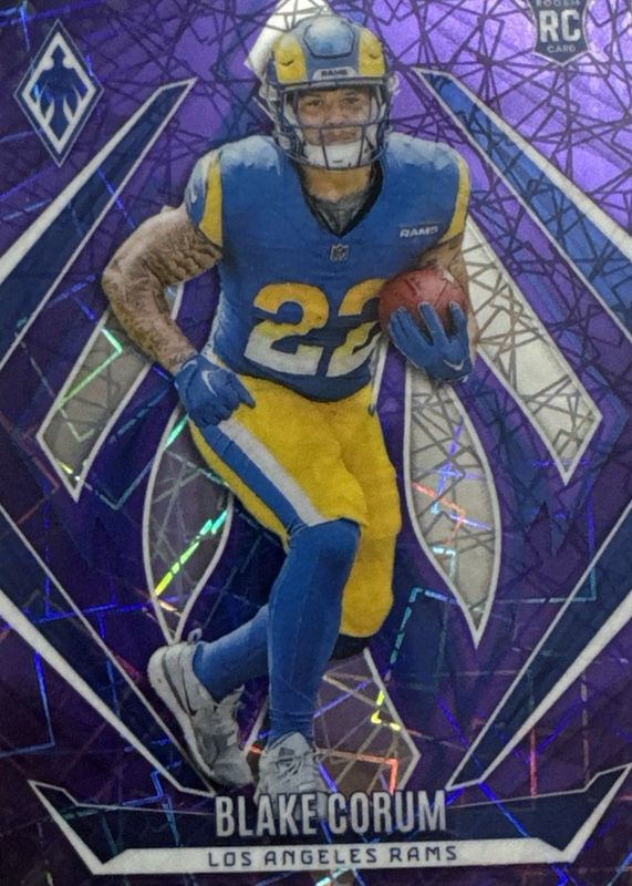 The Blake Corum 2024 Phoenix #158 Purple Lazer Rookie card in Raw condition has not changed in price in the last 30 days and was last sold for $2.75 .