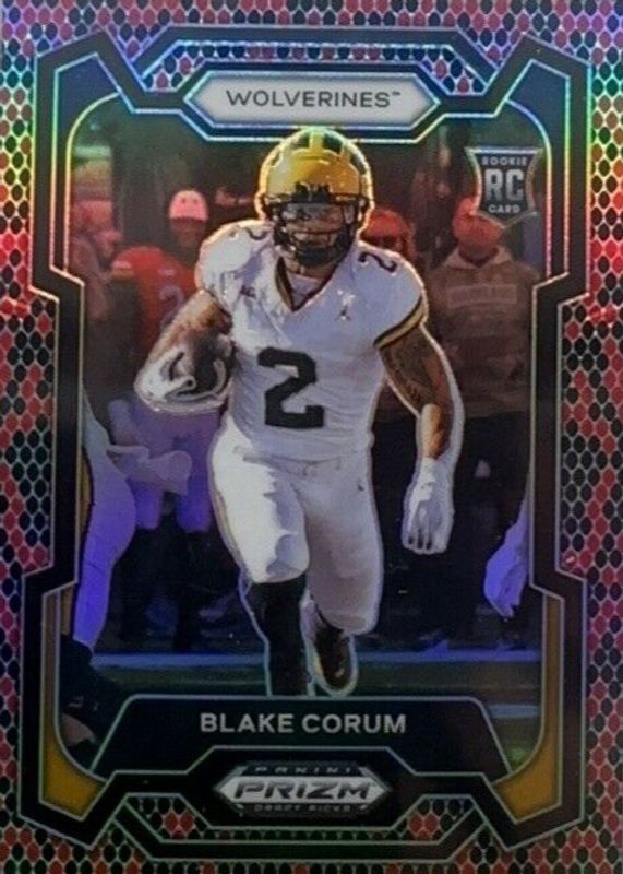 This card is 1 of 185 Blake Corum's card variations in the 2024 Prizm Draft Picks set being tracked by Sports Card Investor, including Base, Green, Purple Wave, Red Ice, and Ruby Wave.