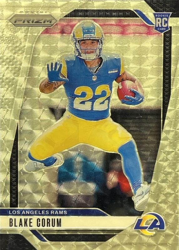 The Blake Corum 2024 Prizm #308 Gold Vinyl /5 Rookie card in Raw condition has not changed in price in the last 30 days and was last sold for $232.50 .