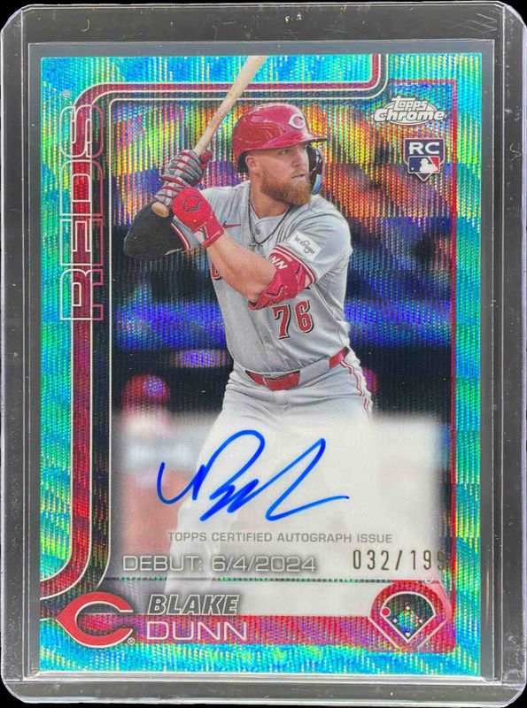 The Blake Dunn 2025 Topps Chrome Update #CRDA-BD Rookie Debut Autographs - Aqua Wave Refractor /199 card is 1 of 29 Blake Dunn's card variations in the 2025 Topps Chrome Update set being tracked by Sports Card Investor, including Rookie Debut Autographs, Rookie Debut Autographs - Black & White Mini-Diamond Refractor, Rookie Lava Lamp Autographs, Rookie Debut Autographs - Refractor /499, and Rookie Debut Autographs - Purple Speckle Refractor /299.
