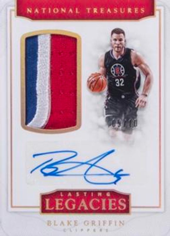 The Blake Griffin 2016 National Treasures #7 Lasting Legacies - Prime /10 card is 1 of 64 Blake Griffin's card variations in the 2016 National Treasures set being tracked by Sports Card Investor, including Base /99, Bronze /25, Gold /10, Emerald /5, and Logoman Autographs Printing Plates Black /1.