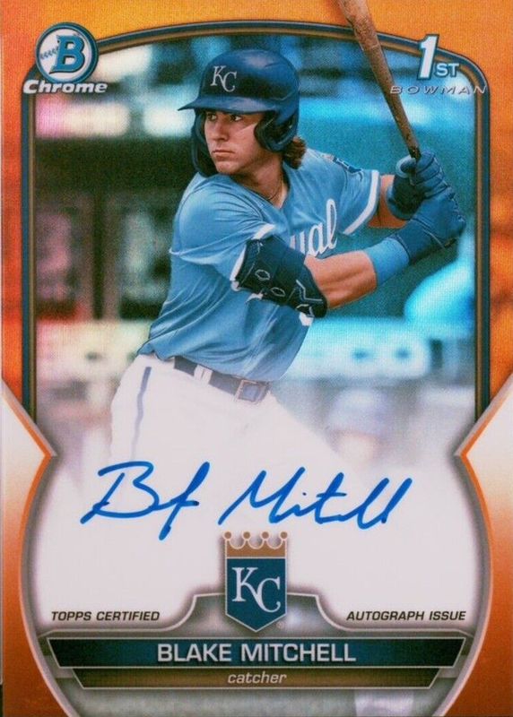 Auctions Ending Soon for Blake Mitchell 2023 Bowman Draft #CDA-BMI Chrome Prospect Auto - Orange Refractor /25 (1st) PSA 10