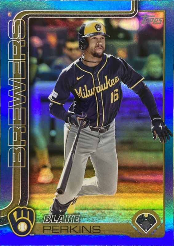 The Blake Perkins 2025 Topps #47 Blue Rainbow /150 card is 1 of 63 Blake Perkins' card variations in the 2025 Topps set being tracked by Sports Card Investor, including Base, Aqua Holo Foil, Diamante Foil, Holo Foil, and Pink Diamante Foil.