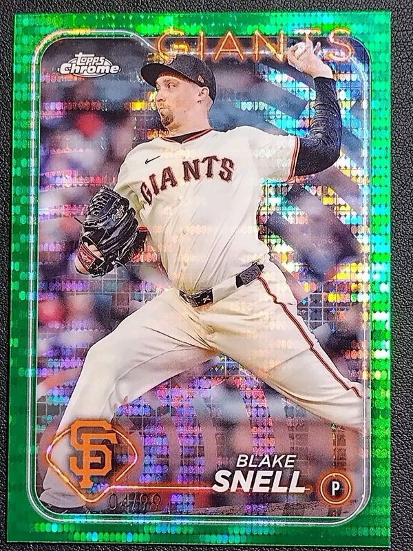 The Blake Snell 2024 Topps Chrome #218 Green Sonar Refractor /99 card is 1 of 15 Blake Snell's card variations in the 2024 Topps Chrome set being tracked by Sports Card Investor, including Base, Pink Refractor, X Fractor, Aqua RayWave Refractor /199, and Blue RayWave Refractor /150.
