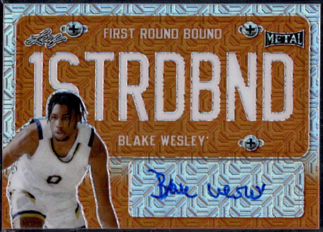 The Blake Wesley 2021 Leaf Metal #FRB-BW1 First Round Bound Autographs - Orange Mojo /3 card is 1 of 88 Blake Wesley's card variations in the 2021 Leaf Metal set being tracked by Sports Card Investor, including Base, Silver Crystal, Silver Mojo, Silver Wave, and Blue Rainbow /50.