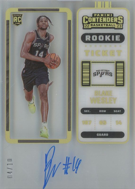 The Blake Wesley 2022 Contenders #133 Rookie Ticket Auto - Clear Ticket /10 card in Raw condition has not changed in price in the last 30 days and was last sold for $88.00 .