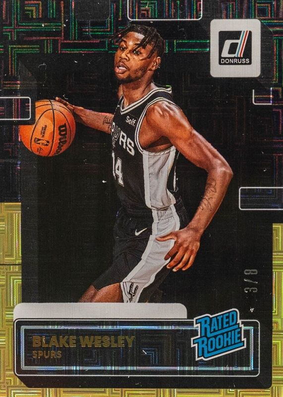 The Blake Wesley 2022 Donruss #225 Choice Black Gold /8 Rookie card in Raw condition has not changed in price in the last 30 days and was last sold for $2.25 .