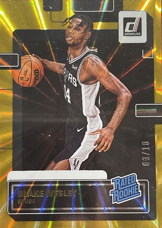 The Blake Wesley 2022 Donruss #225 Holo Gold Laser /10 Rookie card in Raw condition has not changed in price in the last 30 days and was last sold for $12.23 .