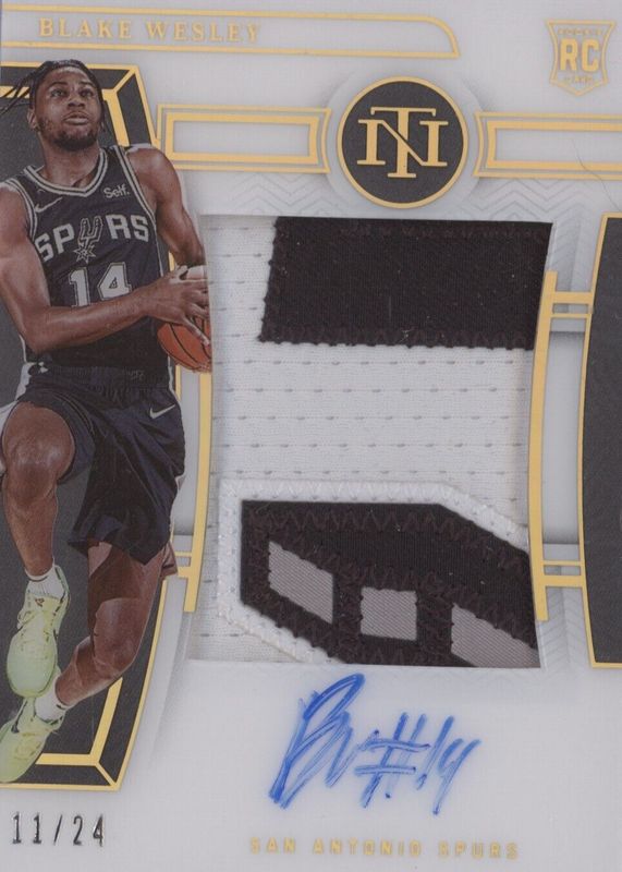 This card is 1 of 10 Blake Wesley's card variations in the 2022 National Treasures set being tracked by Sports Card Investor, including Rookie Patch Auto /99, Rookie Patch Auto - Red /75, Rookie Patch Auto - Bronze /49, Rookie Patch Auto - Pink /25, and Rookie Patch Auto - Gold /10.