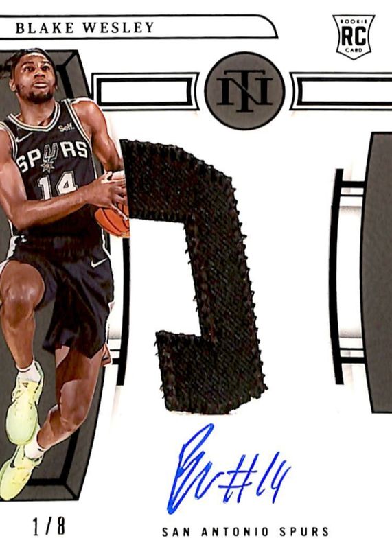 This card is 1 of 10 Blake Wesley's card variations in the 2022 National Treasures set being tracked by Sports Card Investor, including Rookie Patch Auto /99, Rookie Patch Auto - Red /75, Rookie Patch Auto - Bronze /49, Rookie Patch Auto - Pink /25, and Rookie Patch Auto - Gold FOTL /24.
