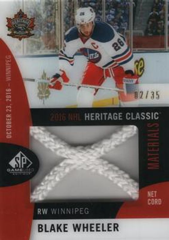 Blake Wheeler's Hockey cards are available in at least 112 sets. Blake Wheeler's biggest 7-day price movers are 2017 SP Game Used #HCNC-BW 2016 NHL Heritage Classic Material Net Cord /35, 2015 SP Game Used #PA-BW Supreme Relics Supreme Sticks /15, and 2014 SP Game Used #53 Gold Spectrum Materials Prime /99.