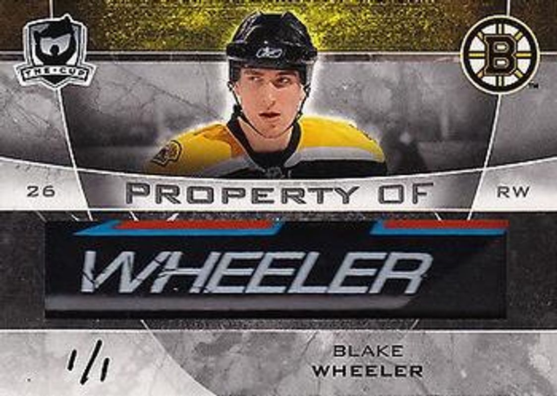 The Blake Wheeler 2008 Upper Deck The Cup #PO-BW Property of /1 Rookie card is 1 of 74 Blake Wheeler's card variations in the 2008 Upper Deck The Cup set being tracked by Sports Card Investor, including Base /249, Artist Proof Foundations Patches, Gold Rainbow /67, Gold /25, and Black /1.