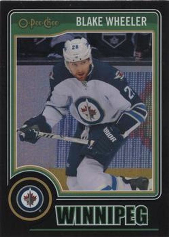 The Blake Wheeler 2014 O-Pee-Chee #345 Black Rainbow /100 card is 1 of 6 Blake Wheeler's card variations in the 2014 O-Pee-Chee set being tracked by Sports Card Investor, including Base, Rainbow, Red, Retro, and Retro Blank Backs.
