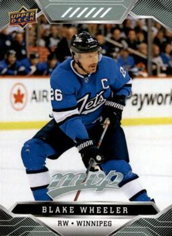 The Blake Wheeler 2019 Upper Deck MVP #11 Base card is 1 of 19 Blake Wheeler's card variations in the 2019 Upper Deck MVP set being tracked by Sports Card Investor, including Blue, Gold Script, Puzzle Backs, Silver Script, and Super Script /25.