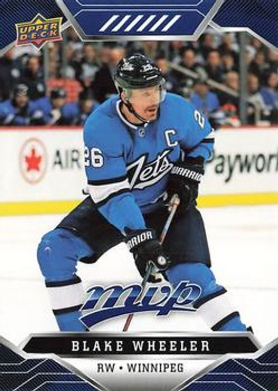 The Blake Wheeler 2019 Upper Deck MVP #11 Blue card is 1 of 19 Blake Wheeler's card variations in the 2019 Upper Deck MVP set being tracked by Sports Card Investor, including Base, Gold Script, Puzzle Backs, Silver Script, and Super Script /25.