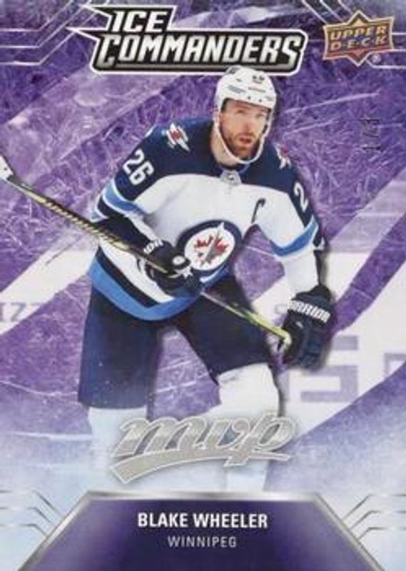 The Blake Wheeler 2019 Upper Deck MVP #IC-10 Ice Commanders Leaderboard Achievements card is 1 of 19 Blake Wheeler's card variations in the 2019 Upper Deck MVP set being tracked by Sports Card Investor, including Base, Blue, Gold Script, Puzzle Backs, and Silver Script.