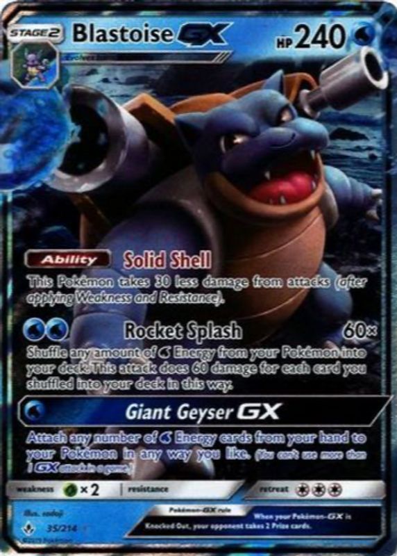The Blastoise GX 2019 Sun & Moon: Unbroken Bonds #035/214 Holo card in Raw TCG (Near Mint) condition has moved up $6.50 (+56.5%) in the last 30 days and was last sold for $18.00 .