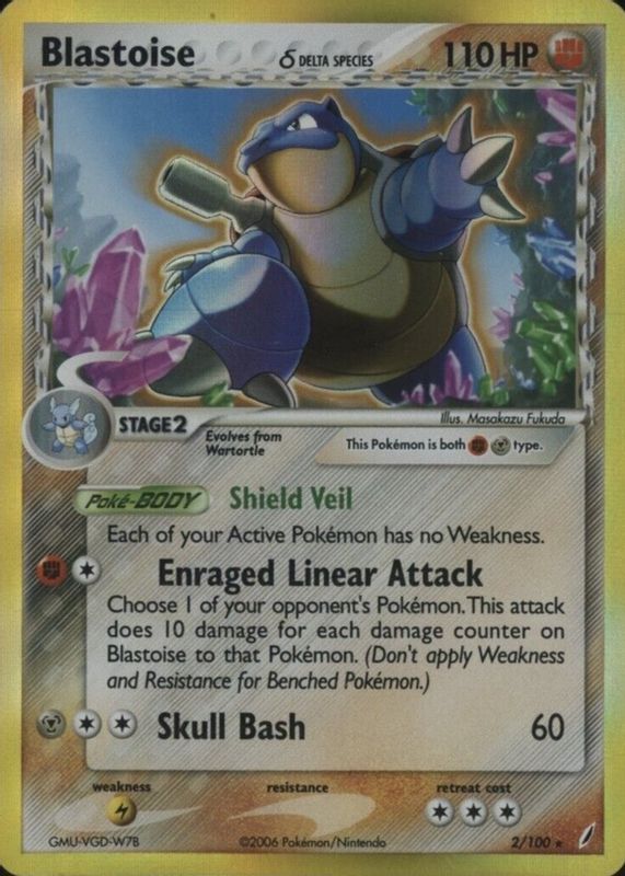 The Blastoise 2006 EX: Crystal Guardians #002/100 Holo card in Raw TCG (Near Mint) condition has moved down -$25.08 (-22.5%) in the last 30 days and was last sold for $86.19 .